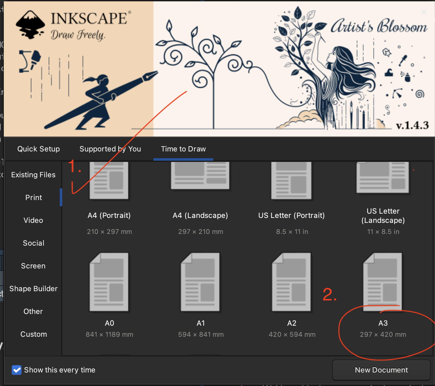 We want to select Print > A3 for a fresh A3 canvas to work with. You can, of course select different size canvases, or set your own for different projects.