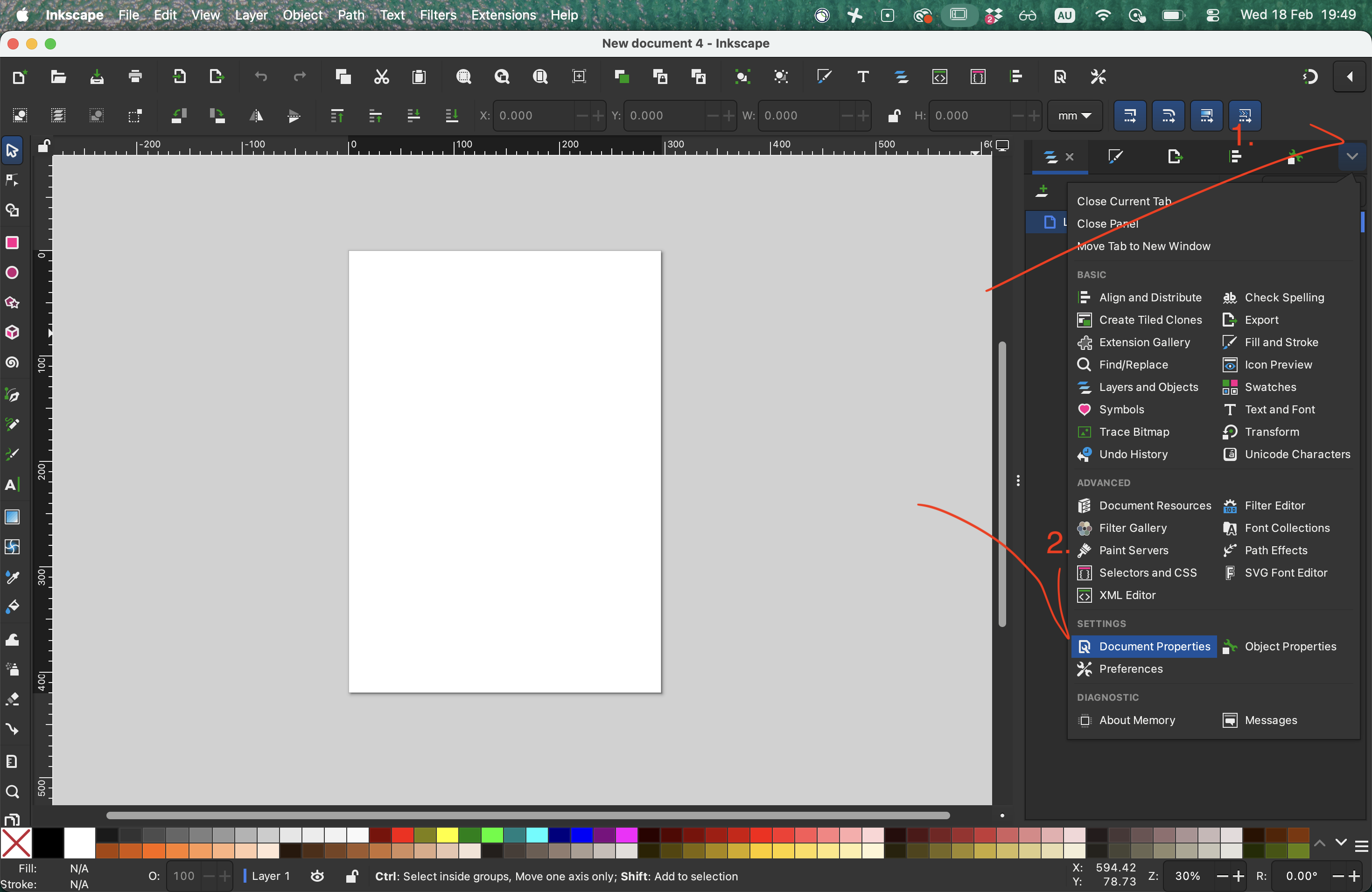 Before we do anything else we are going to set up a grid layout for our canvas. To do this we need to File > Document Properties either in the menu bar or clicking on these buttons below.